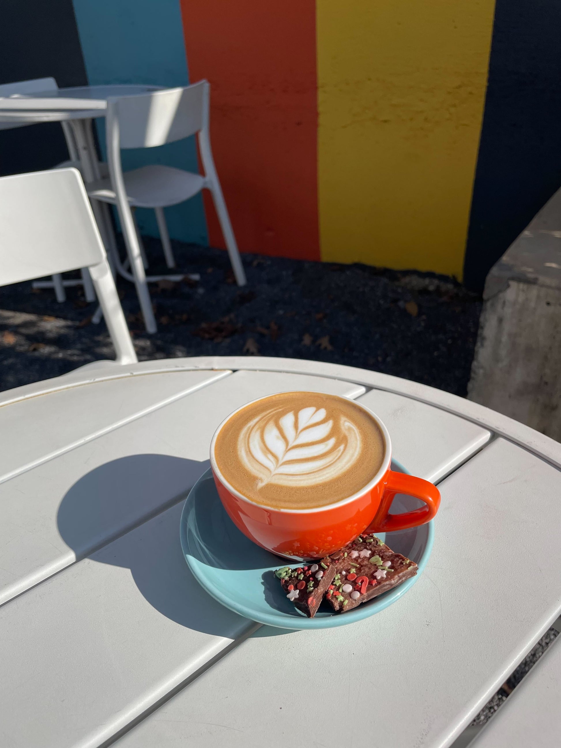 A CAPPUCCINO WITH WAVELENGTH ESPRESSO, HOUSEMADE SPICY PEPPERMINT MOCHA SYRUP, YOUR MILK OF CHOICE, SERVED WITH HOMEMADE CHOCOLATE BARK ON THE SIDE